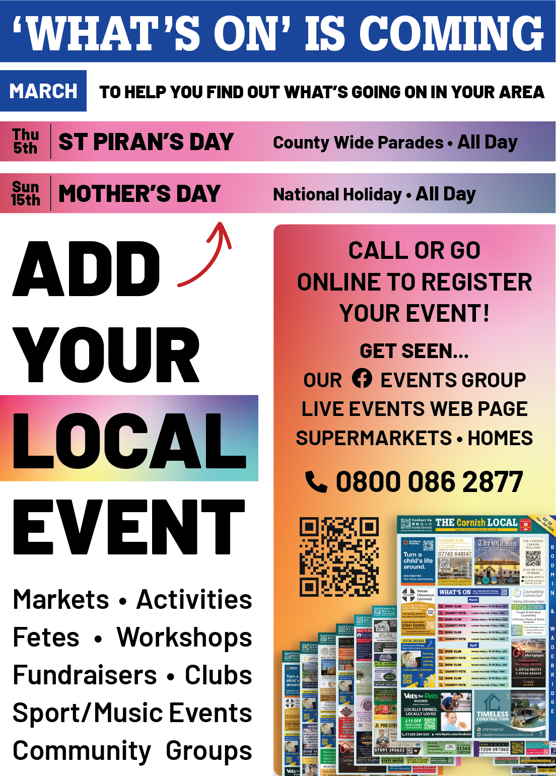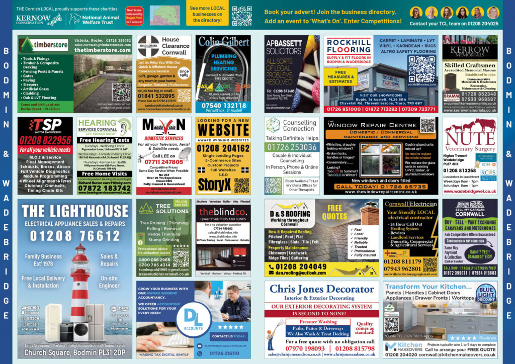 Add your business to the THE Cornish LOCAL Bodmin & Wadebridge Directory 01208 204025 thecornishlocal.co.uk info@thecornishlocal.co.uk