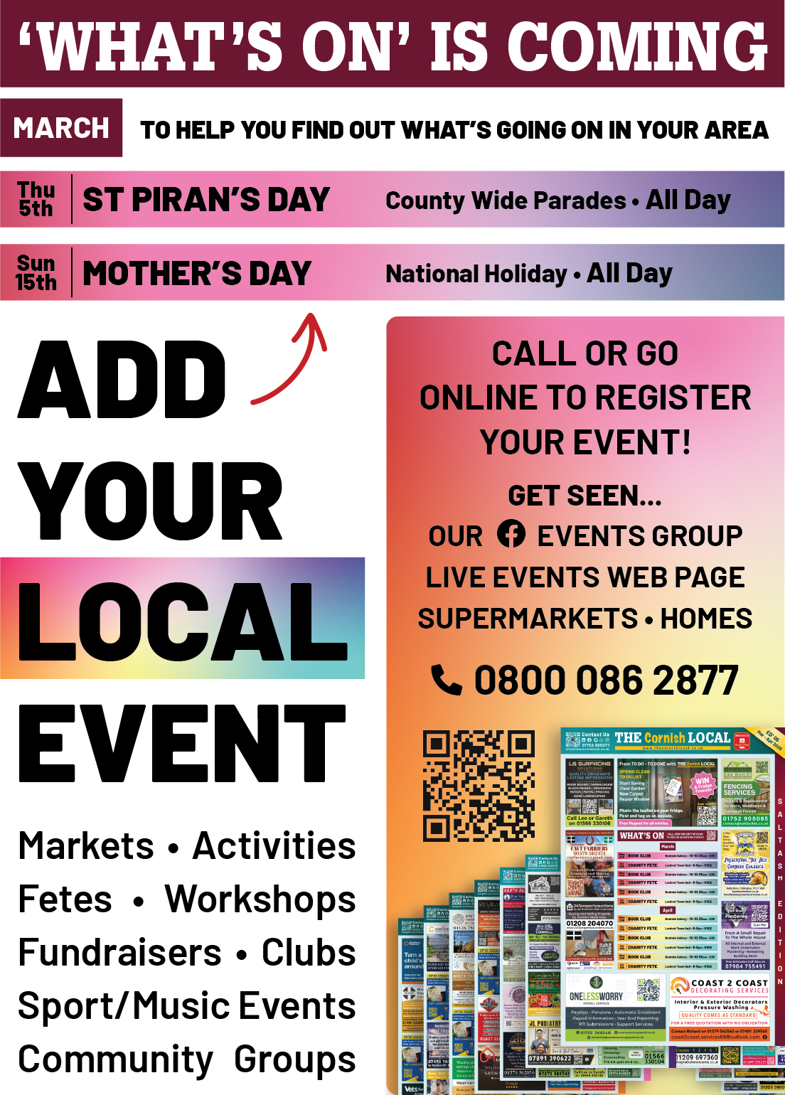 Add your business to the THE Cornish LOCAL Liskeard Directory 0800 086 2811 thecornishlocal.co.uk info@thecornishlocal.co.uk